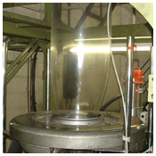 The tube is cooled by cold air blowing onto it; it emerges beyond the nip rollers, still as a flattened tube (known as layflat tubing LFT) is then wound on to a cardboard or plastic tube (known as a core).